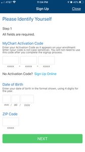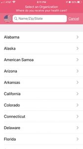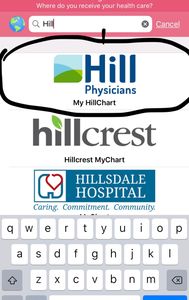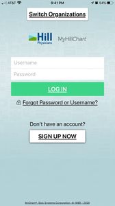 First Time login to the MyChart app will ask for selection of the Hill chart version used by your physician